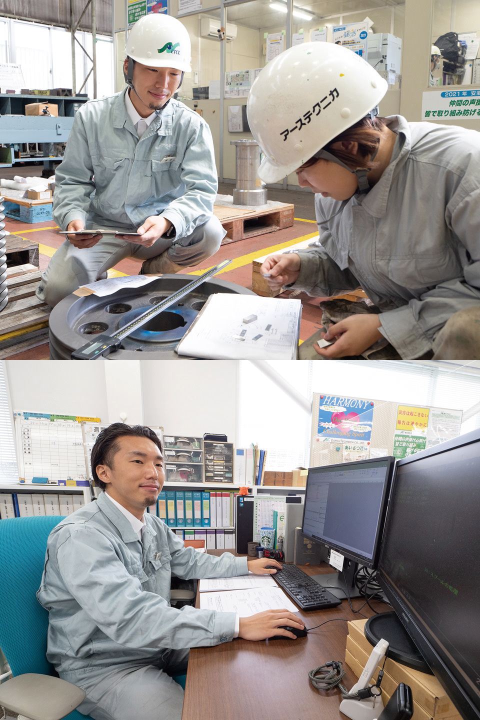 砕石関係の機械全般の品質管理をしています。製品は部品を作って組み上げれば完成、という訳にはいきません。必ず国内規格や国際規格、社内規格を満たす機械が出来ているか検査する必要があります。それらの検査計画や検査立会、成績書の作成などが通常の業務です。自社製品の高い品質を確保し、トラブルを減らすことでアーステクニカのブランド力を守ることが私たちの役割。機械が問題なく稼働し、その状態をメーカーが保証することは“当たり前”のことですが、この“当たり前”を守ることがお客様から信頼を得ること、会社を守ることにつながるのです。